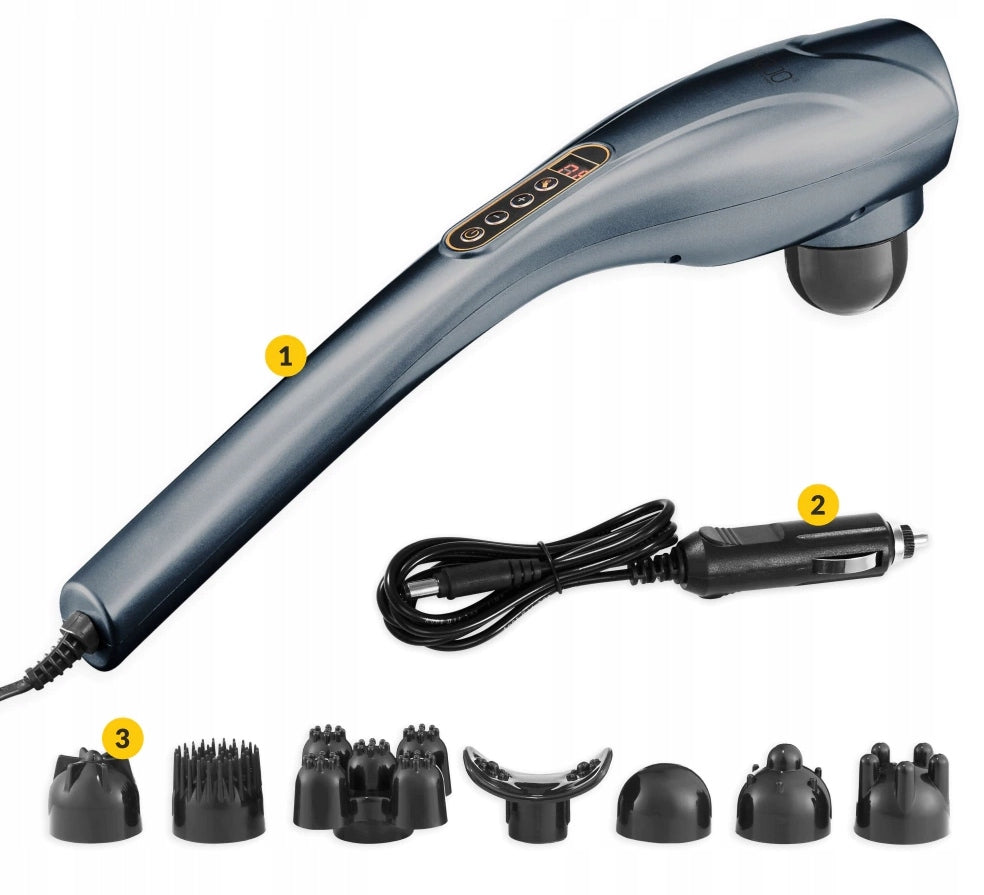 - 7 keičiamų galvučių: Priklausomai nuo masažuojamos kūno dalies ir norimo poveikio.
